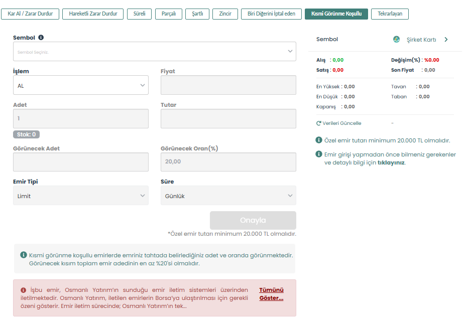 - İşlem Koşulu: Bu özel emir türünden faydalanabilmek için gönderilecek toplam emir tutarının minimum 20.000 TL olması gerekmektedir.