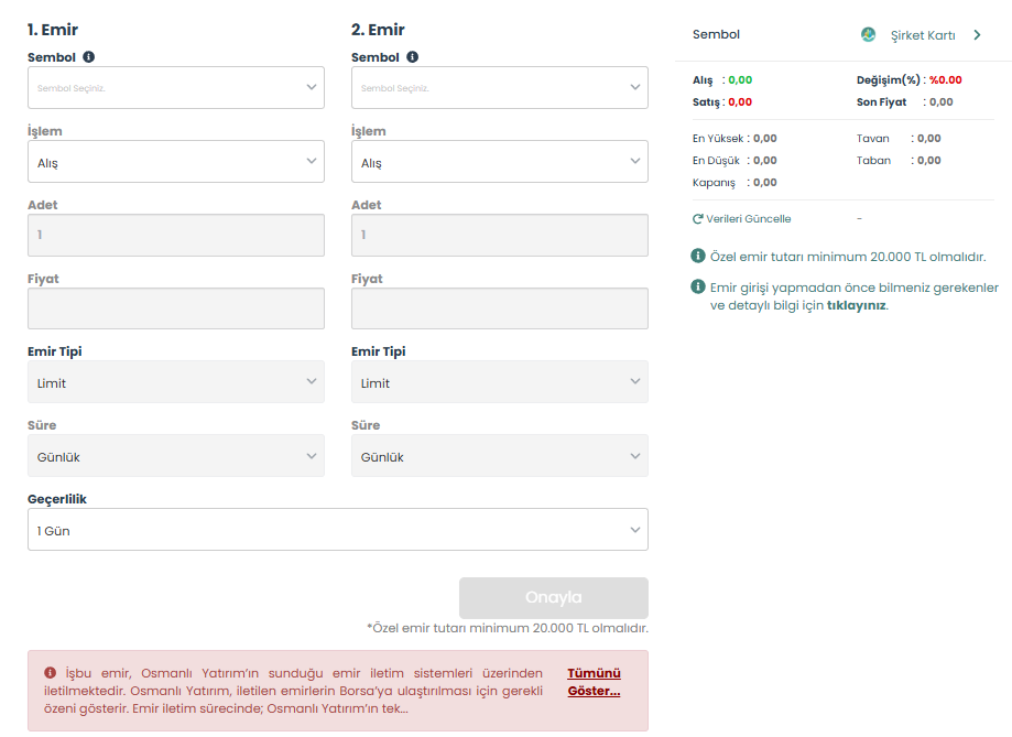 - İşlem Koşulu: Bu özel emir türü için de gönderilecek toplam emir tutarının minimum 20.000 TL olması gerekmektedir.